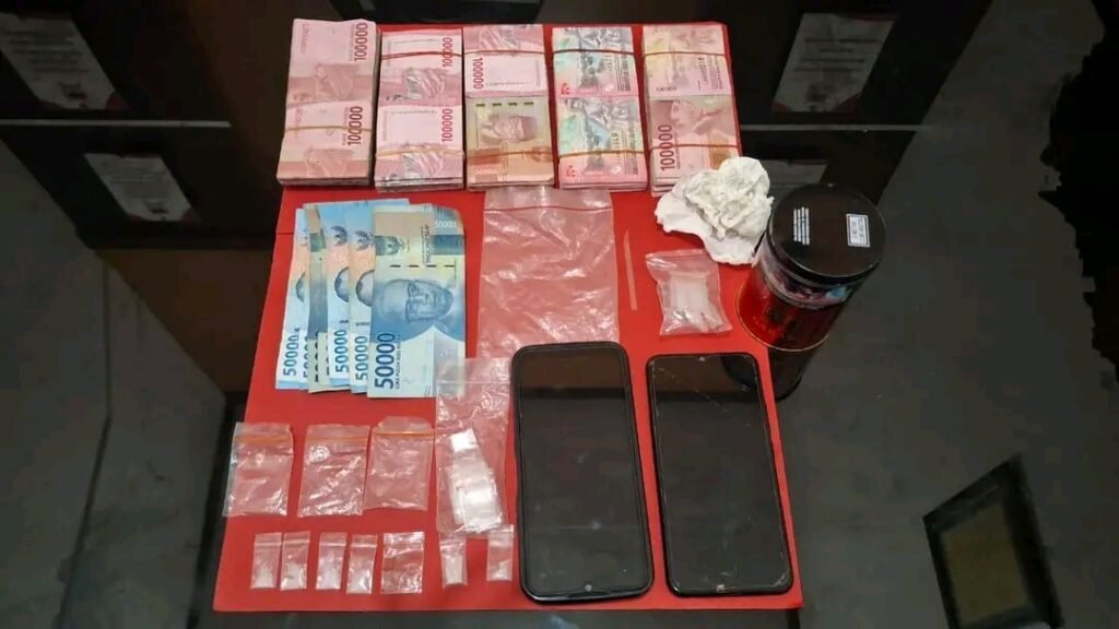 Saat kaleng dibuka di hadapan aparat desa dan saksi, ditemukan barang bukti yang cukup signifikan: 6 plastik bening berisi sabu-sabu (Total berat kotor 1,08 gram). Alat hisap (pipet rakitan). Plastik klip kosong & tisu pembungkus. 2 Unit Handphone dan Uang tunai senilai Rp 47.350.000 diduga hasil penjualan narkoba.